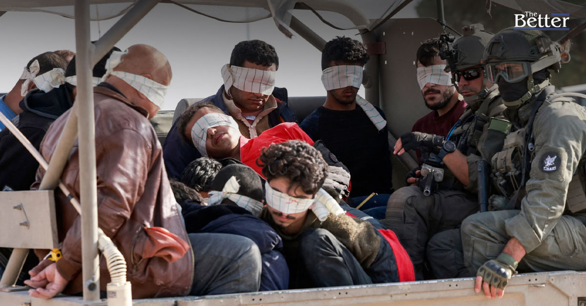 ภาพประกอบข่าว - TOPSHOT - ทหารอิสราเอลเคลื่อนย้ายชาวปาเลสไตน์ที่ถูกควบคุมตัวออกจากฉนวนกาซาเมื่อวันที่ 21 พฤศจิกายน 2566 ท่ามกลางการสู้รบที่ดำเนินอยู่ระหว่างอิสราเอลและขบวนการฮามาสปาเลสไตน์ (ภาพโดย Menahem KAHANA / AFP)