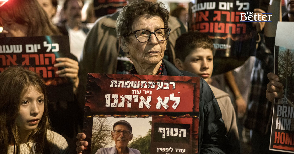 ภาพประกอบข่าว - โยเชฟเวด ลิฟชิตซ์ (8oกลาง) ซึ่งกลุ่มฮามาสปล่อยตัวหลังจากถูกคุมขังนาน 16 วัน เข้าร่วมการประท้วงพร้อมกับคนอื่นๆ ถือป้ายแสดงภาพตัวประกันชาวอิสราเอลคนอื่นๆ ที่ถูกควบคุมตัวในฉนวนกาซา นับตั้งแต่การโจมตีเมื่อวันที่ 7 ตุลาคม ในระหว่างการประท้วงเรียกร้องให้ปล่อยตัวพวกเขานอกพิพิธภัณฑ์เทลอาวีฟ ศิลปะ ซึ่งปัจจุบันเรียกอย่างไม่เป็นทางการว่า "จัตุรัสตัวประกัน" ในเทลอาวีฟ เมื่อวันที่ 9 ธันวาคม พ.ศ. 2566 กองกำลังอิสราเอลได้ปิดล้อมศูนย์กลางเมืองใหญ่ ๆ ในฉนวนกาซา ขณะที่พวกเขาพยายามทำลายล้างกลุ่มฮามาสจากการโจมตีที่ไม่เคยเกิดขึ้นมาก่อนในเดือนตุลาคม เมื่อกลุ่มติดอาวุธบุกทะลวงผ่านกองกำลังติดอาวุธของฉนวนกาซา ชายแดนเพื่อสังหารผู้คนราว 1,200 คน และจับตัวประกัน โดย 137 คนในจำนวนนี้ยังคงถูกคุมขังอยู่ ตามตัวเลขของอิสราเอล (Photo by MARCO LONGARI / AFP)