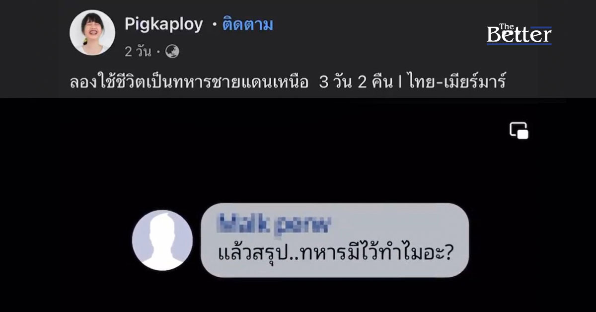 นั่นคือ pigkaploy ใครที่ชอบดูคอนเทนต์ท่องเที่ยวคงจะรู้จักดี ไม่นานมานี้เธอทำคอนเทนต์ไปดูการปฏิบัติหน้าที่ของทหารไทยที่ชายแดนเพื่อนบ้าน พร้อมตั้งชื่อคลิปสั้นๆ ว่า "ทหารมีไว้ทําไม"