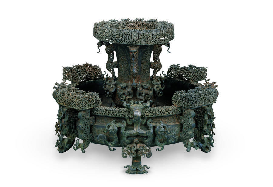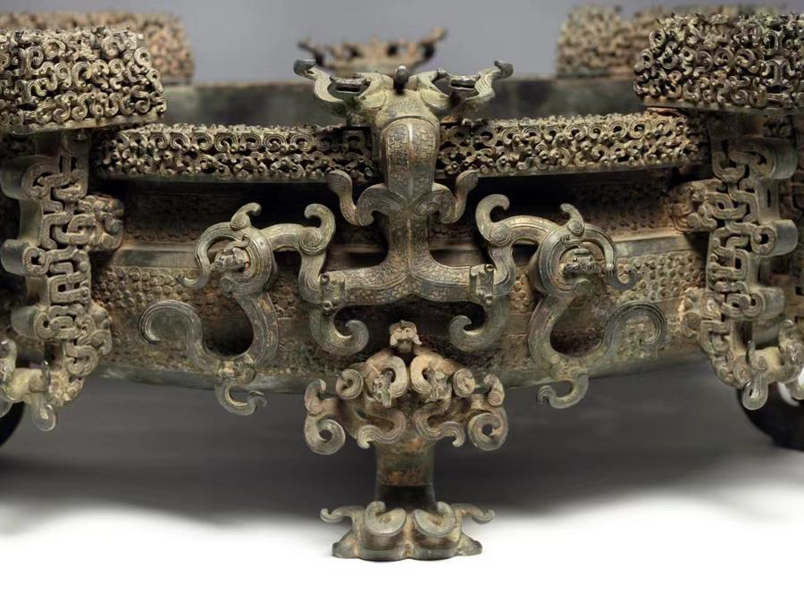 หากมองจากที่ไกล ลายของสิ่งประดิษฐ์ชิ้นนี้อาจดูคล้ายกลุ่มเมฆ แต่แท้จริงแล้วมันคือลวดลายที่ประกอบขึ้นจากฝูงมังกร งู และผานชือ (มังกรในยุคแรก) ขดพันล้อมรอบกันเป็นชั้นๆ ทั้งน่าอัศจรรย์ใจและลายตาในเวลาเดียวกัน เครื่องอุ่นสุรานี้มีชื่อว่า "จุนผานของเจิงโหวอี่" (曾侯乙尊盘) พบจากสุสานของเจิงโหวอี่ เจ้าผู้ครองนครของรัฐเจิงในยุครณรัฐหรือยุคจ้านกั๋ว (475-221 ปีก่อนคริสต์ศักราช) ในเมืองสุยโจว มณฑลหูเป่ยทางตอนกลางของจีน เมื่อปี 1978 ถือเป็นหนึ่งในเครื่องสัมฤทธิ์ยุคชุนชิว (770-476 ปีก่อนคริสต์ศักราช) และยุคจ้านกั๋ว ที่มีความซับซ้อนและวิจิตรประณีตมากที่สุด ปัจจุบันได้รับการเก็บรักษาไว้ที่พิพิธภัณฑ์มณฑลหูเป่ย
