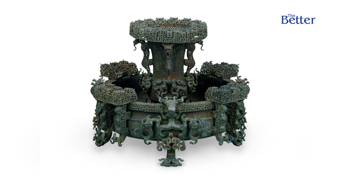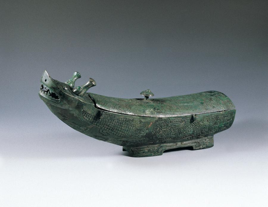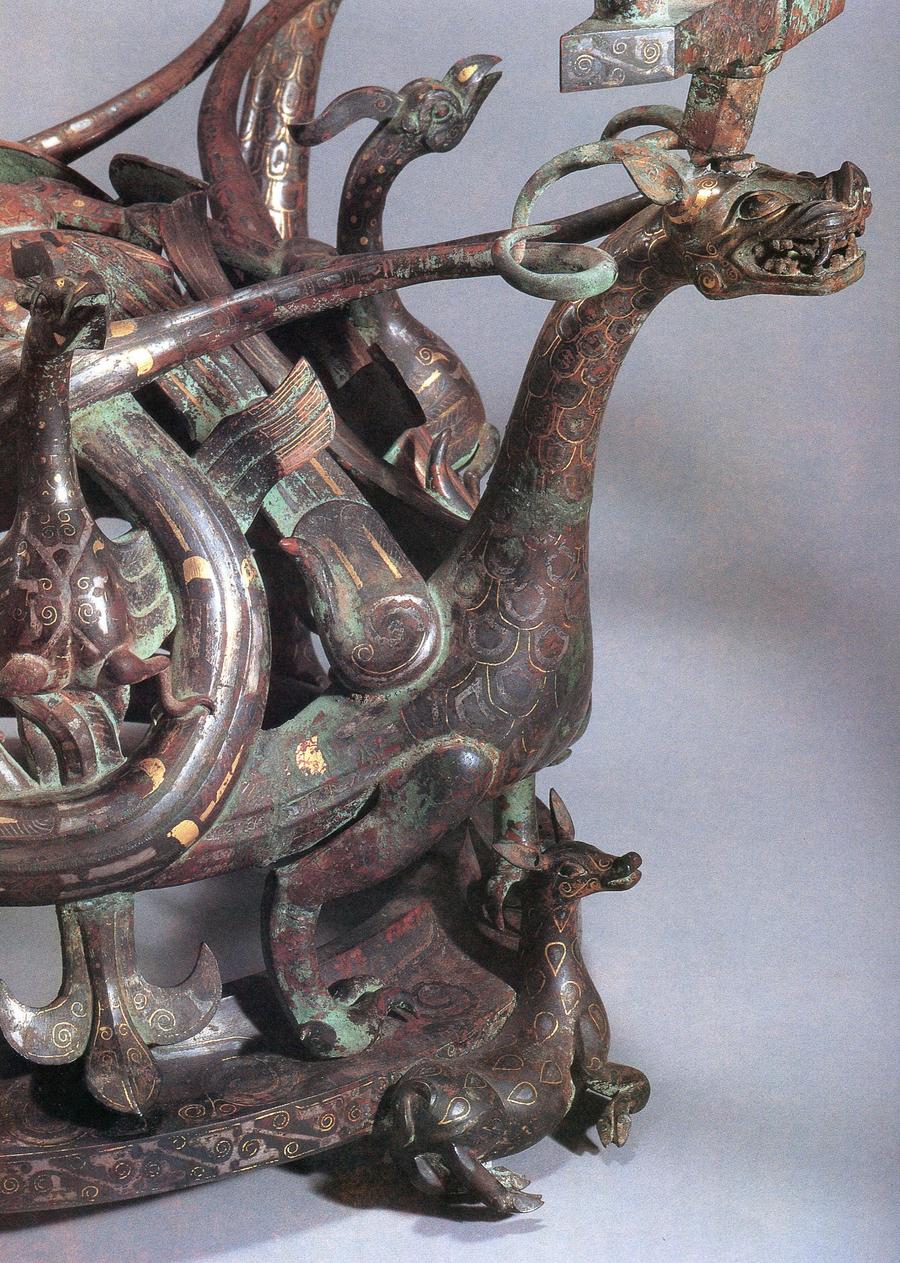 เครื่องอุ่นสุราขนาดยักษ์ที่มีมังกรตัวเล็กๆ หลายสิบตัวขดพันทับกันไปมา ภาชนะใส่สุราที่มีรูปทรงคล้ายเรือมังกร และโต๊ะโบราณลายหงส์และมังกรเหิน ล้วนเป็นภาชนะสัมฤทธิ์โบราณที่มีอายุเก่าแก่หลายพันปีถึงช่วงก่อนราชวงศ์ฉิน โดยทั้งสามชิ้นถูกขุดค้นพบจากคนละพื้นที่ของจีน ได้แก่ หูเป่ย ซานซี และเหอเป่ย ตามลำดับ แต่สิ่งที่โบราณวัตถุล้ำค่าเหล่านี้มีเหมือนกันคือวัฒนธรรมมังกร กล่าวได้ว่า "เครื่องใช้มังกร" สุดวิจิตรงดงามที่ใช้ในการประกอบพิธีกรรมทั้งสามชิ้นนี้ ได้แสดงให้เห็นถึงทักษะขั้นสูงในการหล่อโลหะของชาวจีนโบราณ ปัจจุบันถูกจัดเป็นสมบัติชาติที่ห้ามมิให้นำออกนอกประเทศ