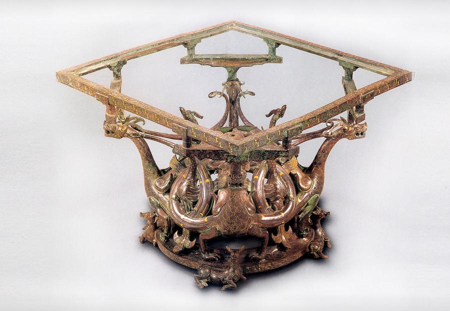 โต๊ะตัวนี้ถูกค้นพบที่สุสานโบราณในหมู่บ้านซานจี๋ อำเภอผิงซาน มณฑลเหอเป่ย เมื่อปี 1977 มีความสูง 36.2 เซนติเมตร หนัก 18.65 กิโลกรัม ฐานโต๊ะมีกวางซิกา (ภาษาจีนเรียก กวางดอกบ๊วย) 4 ตัว ถัดขึ้นมาเป็นมังกรยืน 4 ตัว มีหงส์ในท่าชูคอส่งเสียงร้องและสยายปีกพร้อมโบยบินอยู่ระหว่างกลางของลำตัวมังกรที่ขดพันกันไปมา ลวดลายหงส์ร่อนมังกรเหินนี้ มีทั้งการเคลื่อนไหวและความนิ่งสงบที่ผสานกันอย่างลงตัวและแปลกพิสดาร