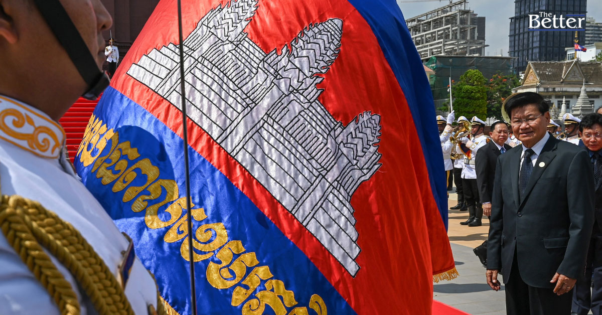Photo - ทองลุน สีสุลิด ประธานาธิบดีลาว (ขวา) มองธงชาติกัมพูชาระหว่างเยือนอนุสาวรีย์เอกราชในกรุงพนมเปญ เมื่อวันที่ 23 เมษายน 2567 (ภาพโดย TANG CHHIN Sothy และ TANG CHHIN SOTHY / AFP)