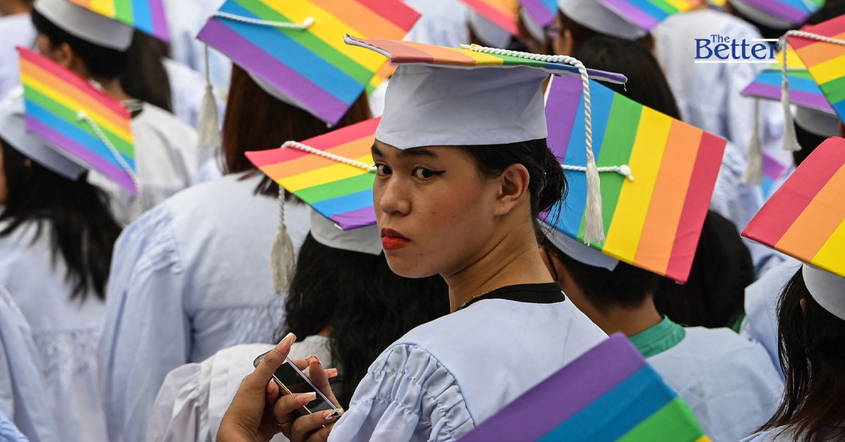 หมายเหตุ - ภาพประกอบข่าวไม่เกี่ยวกับเนื้อหา (TOPSHOT - สมาชิกนักศึกษาของชุมชน LGBTQIA+ เฉลิมฉลองในขณะที่พวกเขาเข้าร่วม "Rainbow Graduation" ในเมืองเกซอนซิตี้ เมโทรมะนิลา เมื่อวันที่ 22 มิถุนายน 2024 เพื่อเป็นการเฉลิมฉลองเดือน Pride Month รัฐบาลท้องถิ่นได้จัดพิธีมอบสิทธิ์ในการสำเร็จการศึกษาให้กับสมาชิกของชุมชน โดยสามารถสวมชุดที่ตนเองชอบได้ (ภาพโดย JAM STA ROSA / AFP)