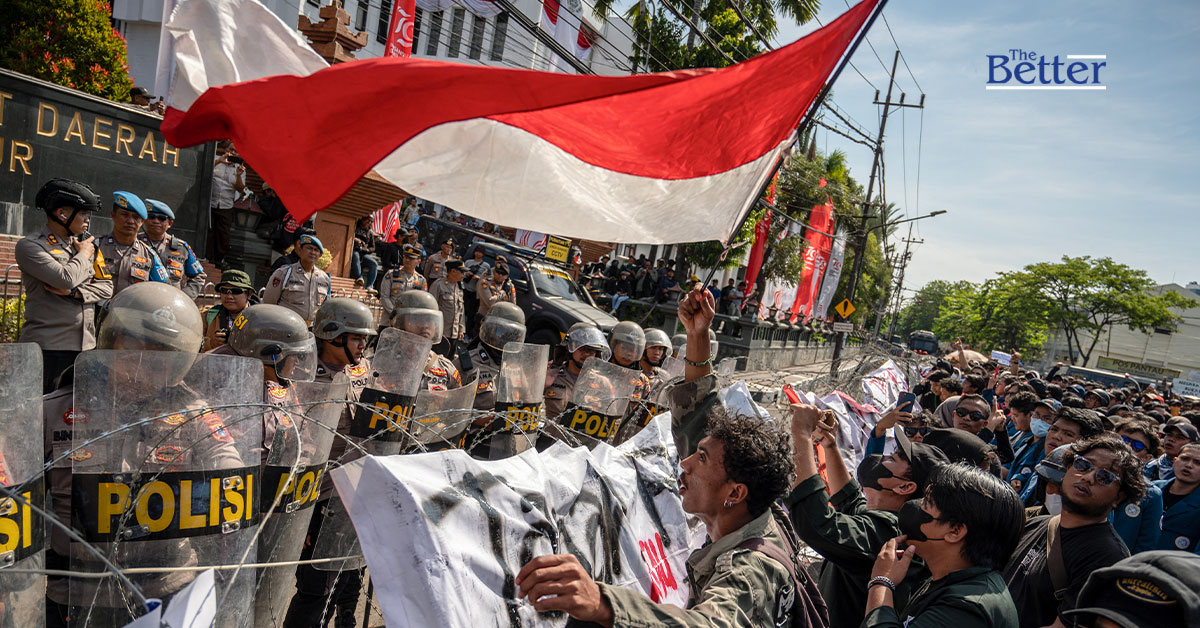 Photo - (TOPSHOT) - ผู้ประท้วงตะโกนคำขวัญในระหว่างการประท้วงต่อต้านการย้ายเพื่อคว่ำการพิจารณาคดีของศาลรัฐธรรมนูญที่เปลี่ยนกฎการมีสิทธิ์สำหรับผู้สมัครในการเลือกตั้งทั่วไปในปลายปีนี้ต่อหน้ารัฐสภาจังหวัดชวาตะวันออกในสุราบายาเมื่อวันที่ 23 สิงหาคม 2567 (ภาพถ่ายโดย Juni Kriswanto / AFP)