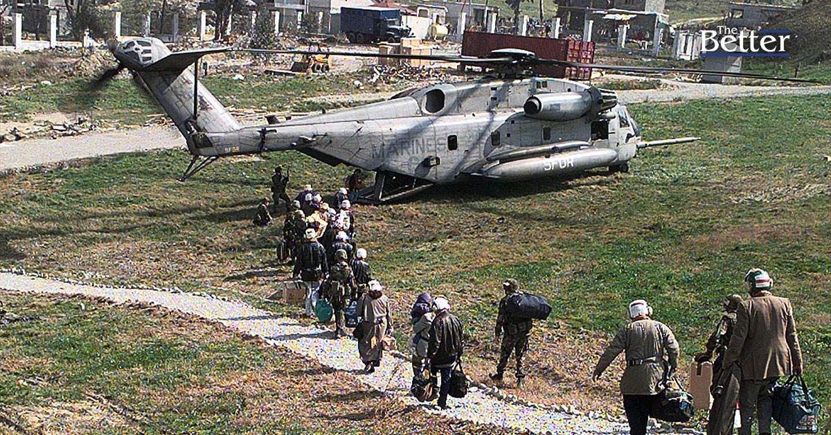 Photo - พลเมืองอเมริกันเดินเป็นแถวเดียวผ่านแนวป้องกันที่แน่นหนาเพื่อขึ้นเฮลิคอปเตอร์โจมตี CH-53 Super Stallion ของนาวิกโยธินสหรัฐ จากสนามภายในบริเวณที่พักของสถานทูตสหรัฐฯ ในเมืองติรานา หลังจากที่รัฐบาลแอลเบเนียสูญเสียการควบคุมกองทัพและสลายตัวลงสู่ภาวะไร้ระเบียบ ภาพถ่ายโดย Brett Siegel ของกองทัพเรือสหรัฐฯ ผู้ช่วยช่างภาพระดับ 2