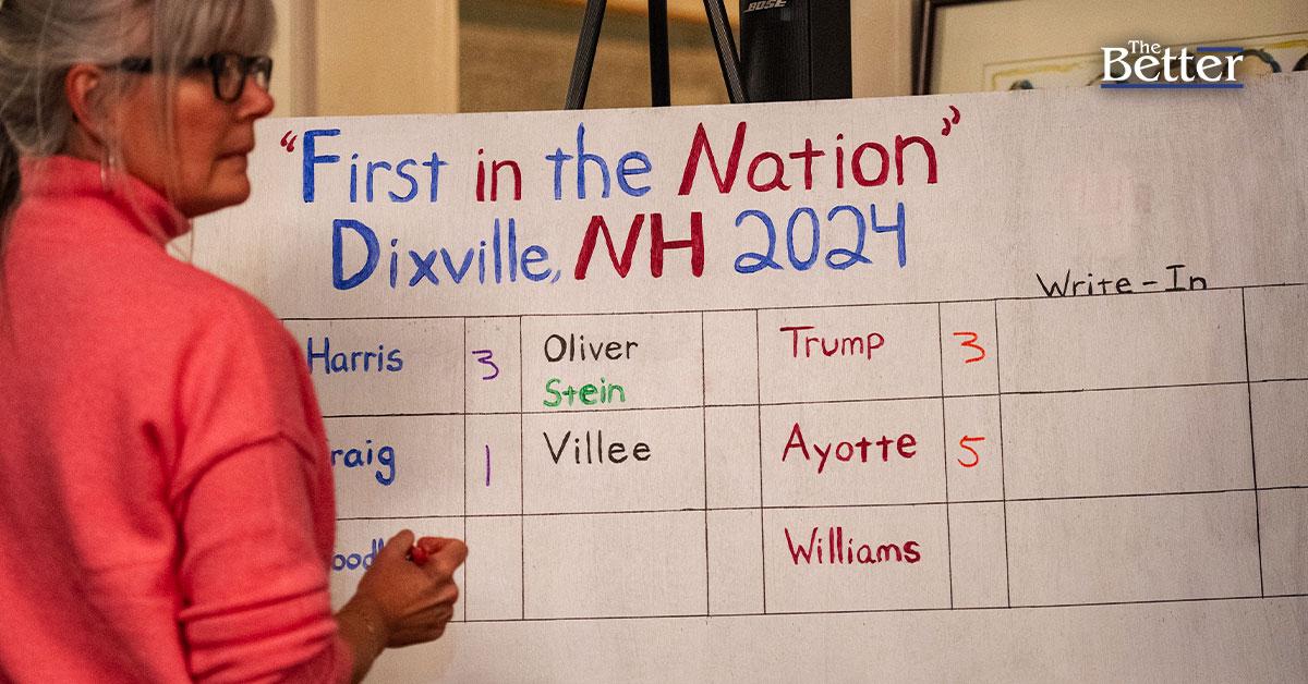 Photo - แฮร์ริสและทรัมป์เสมอกัน 3 ต่อ 3 ขณะที่ชาวเมืองดิ๊กซ์วิลล์ นอตช์ลงคะแนนเสียงในการเลือกตั้งสหรัฐฯ ในเวลาเที่ยงคืนที่ห้องนั่งเล่นของ Tillotson House ที่ Balsams Grand Resort ซึ่งถือเป็นการลงคะแนนเสียงครั้งแรกในการเลือกตั้งสหรัฐฯ ที่ดิ๊กซ์วิลล์ นอตช์ รัฐนิวแฮมป์เชียร์ เมื่อวันที่ 5 พฤศจิกายน 2024 มีผู้ลงคะแนนเสียง 6 คนในดิ๊กซ์วิลล์ นอตช์ โดย 4 คนเป็นรีพับลิกัน และอีก 2 คนไม่ประกาศตนว่าเลือกพรรคไหน (ภาพโดย Joseph Prezioso / AFP)
