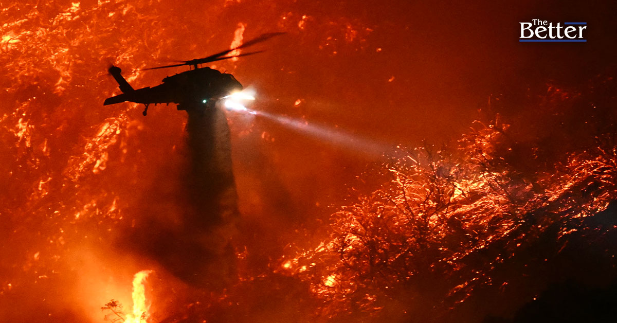 Photo - เฮลิคอปเตอร์ดับเพลิงกำลังฉีดน้ำในขณะที่ไฟป่าพาลิเซดส์ กำลังลุกลามใกล้ชุมชน Mandeville Canyon และ Encino รัฐแคลิฟอร์เนีย เมื่อวันที่ 11 มกราคม 2025 ไฟป่าพาลิเซดส์ทำลายบ้านเรือนหลายพันหลังจนได้รับความเสียหาย ซึ่งประธานาธิบดีโจ ไบเดนของสหรัฐฯ เปรียบเทียบว่าเป็น "ฉากสงคราม" (ภาพโดย Patrick T. Fallon / AFP)