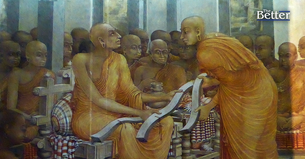 Photo - จิตรกรรมฝาผนังวัดกัลยานีราชมหาวิหาร ประเทศศรีลังก แสดงเหตุการณ์ตอนที่พระพุทธโฆสะถวายต้นฉบับคัมภีร์วิสุทธิมัคค์ให้กับคณะสงฆ์ลังกา (ภาพโดย Photo Dharma)