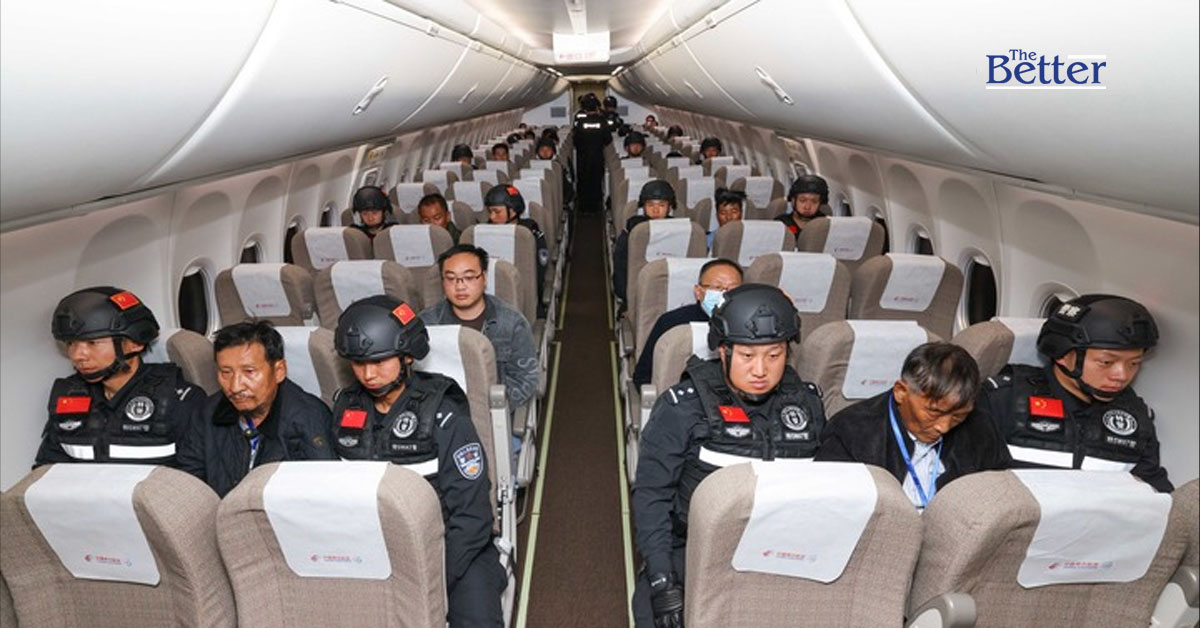 (แฟ้มภาพซินหัว : ตำรวจจีนควบคุมผู้ต้องสงสัยในคดีอาญาบนเครื่องบินเช่าเหมาลำที่มุ่งหน้าไปจีน วันที่ 30 ม.ค. 2024)