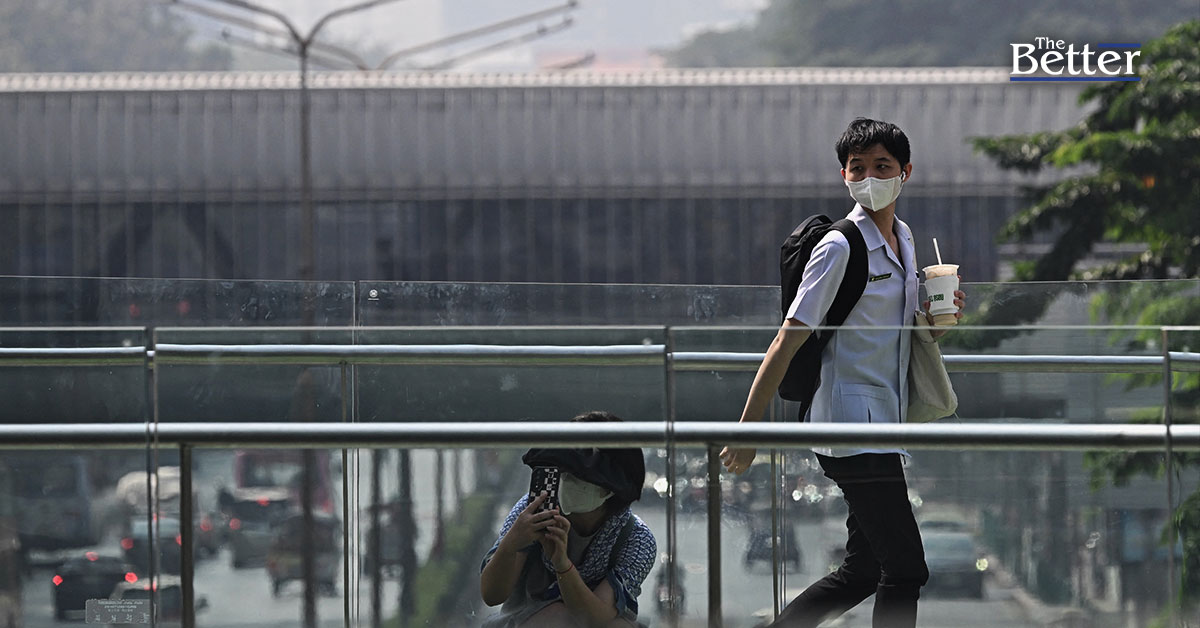 Photo - ผู้คนสวมหน้ากากอนามัยบนทางเดินเท้าท่ามกลางมลพิษทางอากาศที่สูงในกรุงเทพฯ เมื่อวันที่ 24 มกราคม 2568 (ภาพโดย Lillian SUWANRUMPHA / AFP)