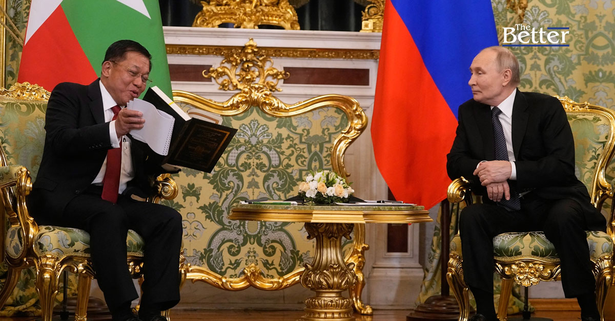 Photo - ผู้บัญชาการทหารสูงสุดของเมียนมา มิน ออง หล่าย มอบหนังสือคำทำนายเรื่องอดีตชาติให้แก่ประธานาธิบดีรัสเซีย วลาดิมีร์ ปูติน ระหว่างการพบปะกันที่พระราชวังเครมลิน ในกรุงมอสโก เมื่อวันที่ 4 มีนาคม 2568 (ภาพโดย Pavel Bednyakov / POOL / AFP)