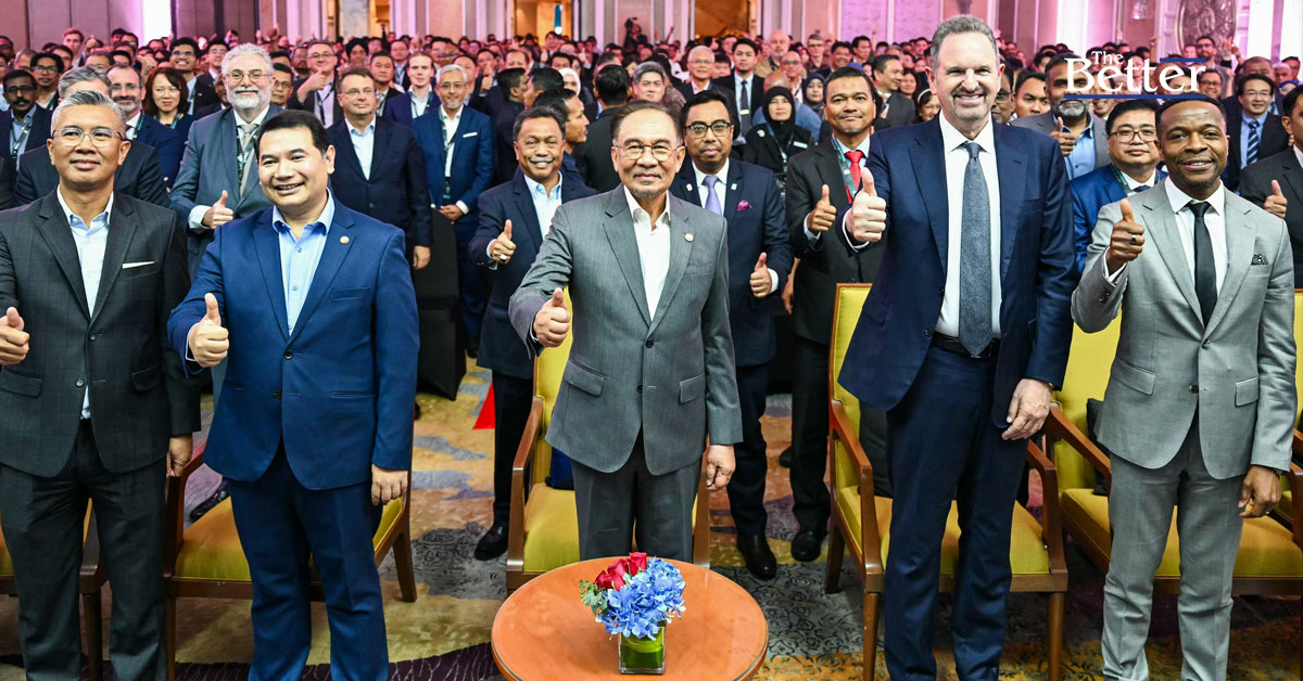 Photo - อันวาร์ อิบราฮิม นายกรัฐมนตรีมาเลเซีย (กลาง) และเรเน ฮาส ซีอีโอของบริษัท ARM Holdings บริษัทผู้ผลิตชิปรายใหญ่ของอังกฤษ (คนที่ 2 จากขวา) ชูนิ้วโป้งในพิธีเปิดตัวความร่วมมือระหว่างมาเลเซียและ ARM Holdings ที่กรุงกัวลาลัมเปอร์ เมื่อวันที่ 5 มีนาคม 2025 (Photo by Mohd RASFAN / AFP)