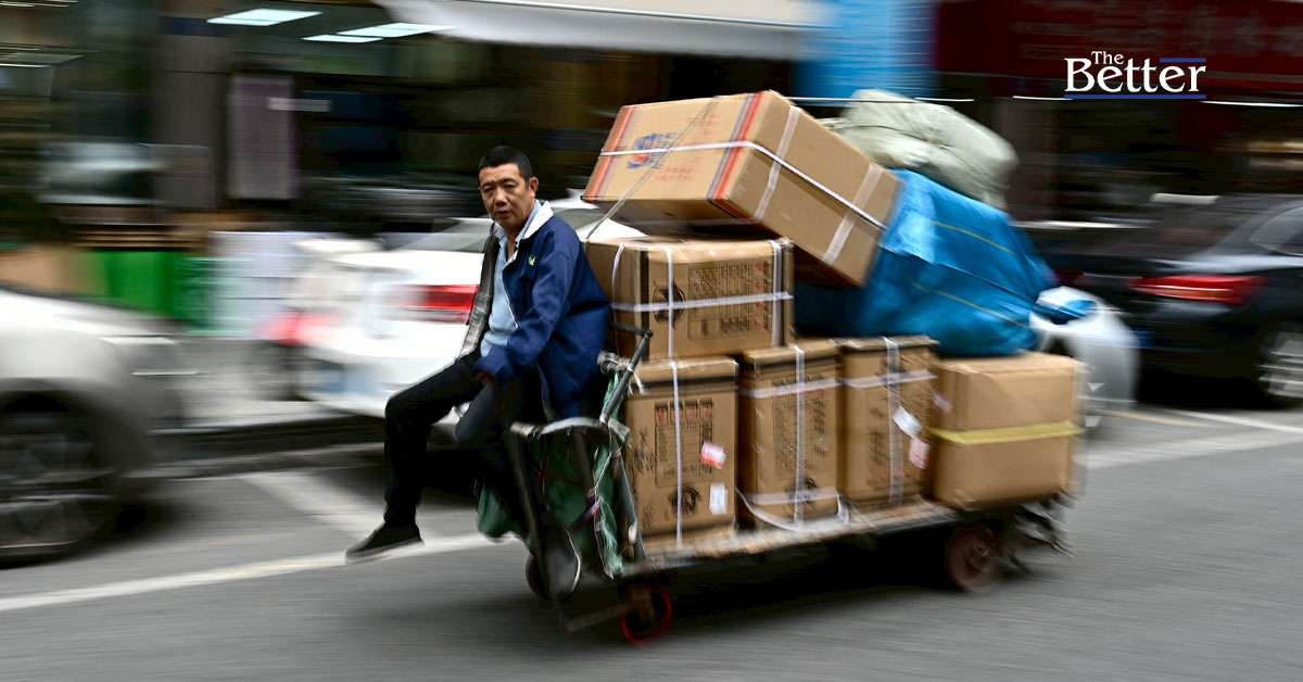 Photo - ภาพถ่ายนี้ถ่ายเมื่อวันที่ 18 กุมภาพันธ์ 2025 แสดงให้เห็นชายคนหนึ่งกำลังขนกล่องสินค้าบนแท่นไฟฟ้าที่ย่านการค้าในเมืองตงกวน มณฑลกวางตุ้งทางตอนใต้ของจีน (ภาพโดย Pedro PARDO / AFP)
