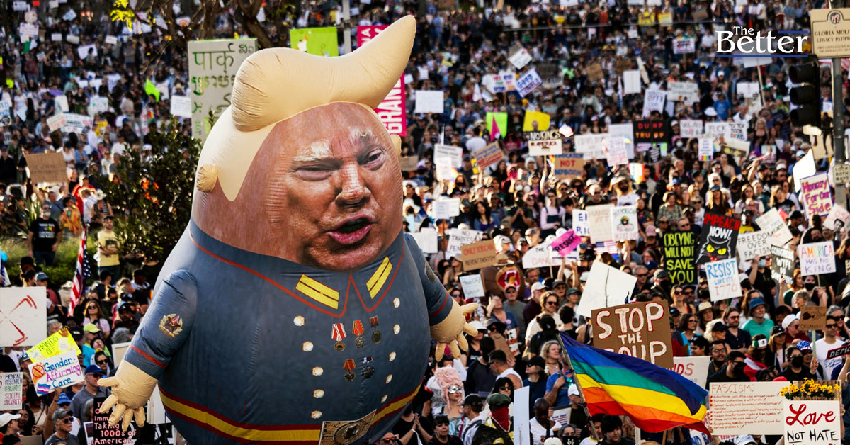 Photo - ลูกโป่งขนาดใหญ่ที่มีรูปประธานาธิบดีโดนัลด์ ทรัมป์ ของสหรัฐฯ ปรากฏอยู่เหนือกลุ่มผู้ประท้วงที่ถือป้ายระหว่างการประท้วง "Hands Off!" ทั่วประเทศเพื่อต่อต้านทรัมป์และที่ปรึกษาของเขา อีลอน มัสก์ ซีอีโอของบริษัทเทสลา ในย่านดาวน์ทาวน์ของลอสแองเจลิส เมื่อวันที่ 5 เมษายน 2025 โดยผู้ประท้วงหลั่งไหลลงสู่ท้องถนนในเมืองใหญ่หลายแห่งของสหรัฐฯ เมื่อวันเสาร์เพื่อต่อต้านนโยบายสร้างความแตกแยกของประธานาธิบดีโดนัลด์ ทรัมป์ ซึ่งถือเป็นการชุมนุมครั้งใหญ่ที่สุดนับตั้งแต่เขากลับมาดำรงตำแหน่งในทำเนียบขาว ผู้ต่อต้านนโยบายของประธานาธิบดีจากพรรครีพับลิกัน ไม่ว่าจะเป็นการลดจำนวนพนักงานของรัฐบาล การเก็บภาษีการค้า และการทำลายเสรีภาพพลเมือง ต่างรวมตัวกันในวอชิงตัน นิวยอร์ก ฮูสตัน ลอสแองเจลิส และฟลอริดา รวมถึงสถานที่อื่นๆ (ภาพโดย ETIENNE LAURENT / AFP)