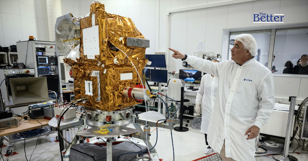 Photo - นักวิทยาศาสตร์ชี้ไปที่ดาวเทียม MicroCarb (ภารกิจตรวจวัดคาร์บอนไดออกไซด์) ในห้องปลอดเชื้อของ CNES (ศูนย์แห่งชาติเพื่อการศึกษาด้านอวกาศ) ในเมืองตูลูส ทางตะวันตกเฉียงใต้ของฝรั่งเศส เมื่อวันที่ 1 เมษายน พ.ศ. 2568 (ภาพถ่ายโดย Lionel BONAVENTURE / AFP)