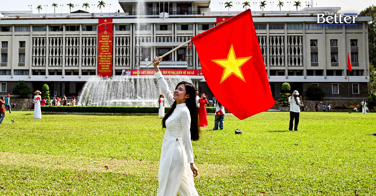 Photo - TOPSHOT - ผู้หญิงคนหนึ่งโพสท่ากับธงชาติเวียดนามหน้าทำเนียบเอกราชในนครโฮจิมินห์ เมื่อวันที่ 28 เมษายน 2025 ก่อนการเฉลิมฉลองครบรอบ 50 ปีสิ้นสุดสงครามเวียดนาม (ภาพโดย Nhac NGUYEN / AFP)