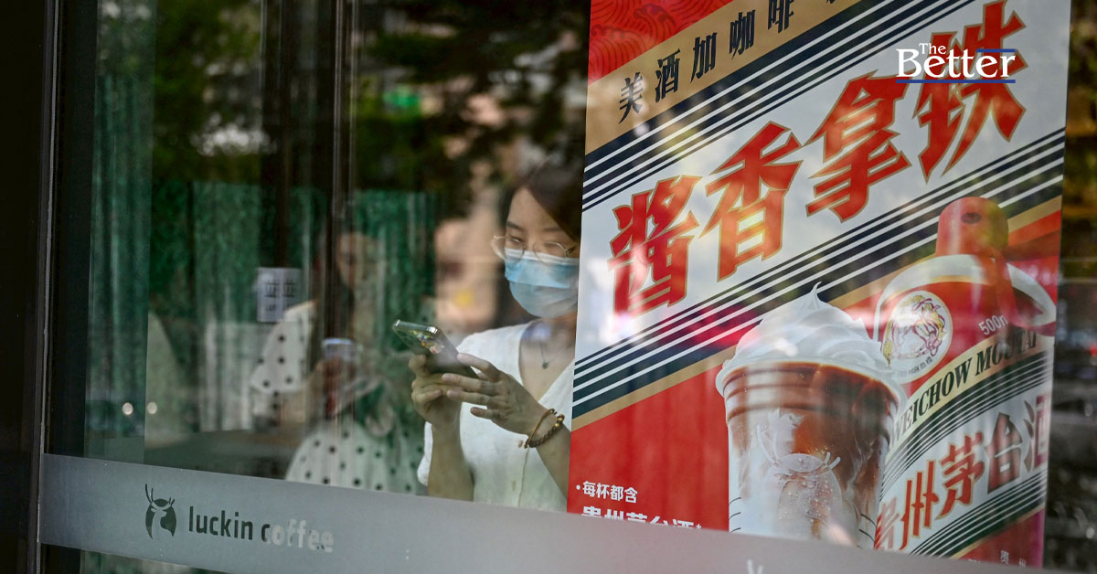 Photo - ลูกค้ากำลังรอรับออเดอร์ที่ร้านกาแฟ Luckin Coffee ในกรุงปักกิ่งเมื่อวันที่ 4 กันยายน 2023 ขณะที่บริษัทกำลังเปิดตัวผลิตภัณฑ์ใหม่ล่าสุดที่ร่วมมือกับแบรนด์สุราจีน Kweichow Moutai (ภาพโดย Jade GAO / AFP)