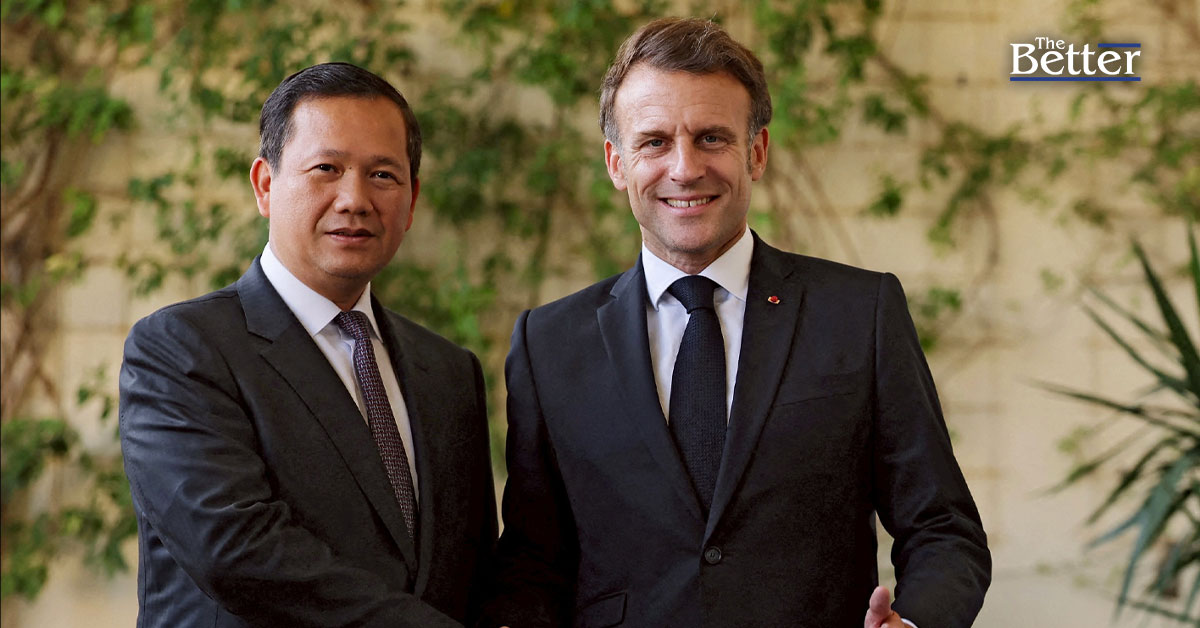 Photo - ประธานาธิบดีฝรั่งเศส เอ็มมานูเอล มาครง (ขวา) ต้อนรับนายกรัฐมนตรีฮุน มาเนต ของกัมพูชา ก่อนการประชุมที่จังหวัดนีซ ส่วนหนึ่งของประชุมสหประชาชาติว่าด้วยมหาสมุทร (UNOC3) ในเมืองนีซ เมื่อวันที่ 10 มิถุนายน 2025 (ภาพโดย Christian Hartmann / POOL / AFP)
