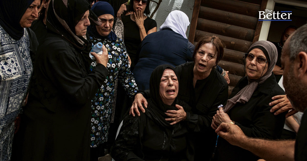 Photo - TOPSHOT - แม่ของเหยื่อรายหนึ่งจากการโจมตีด้วยขีปนาวุธของอิหร่านซึ่งทำลายอาคารสามชั้นในเมืองทามราทางภาคเหนือของอิสราเอล-อาหรับ กำลังได้รับการปลอบโยนระหว่างงานศพในเมืองทามราทางภาคเหนือของอิสราเอล-อาหรับ เมื่อวันที่ 17 มิถุนายน 2025 (ภาพถ่ายโดย JOHN WESSELS / AFP)