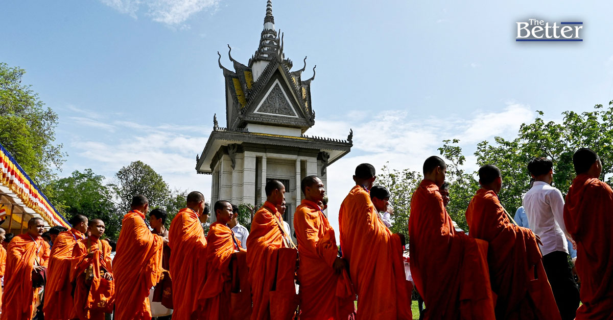 Photo - (ภาพประกอบข่าวไม่เกี่ยวกับเนื้อหา) พระสงฆ์กัมพูชายืนเรียงแถวเพื่อรับอาหารและบิณฑบาตเนื่องใน “วันรำลึก” ประจำปีเพื่อรำลึกถึงเหยื่อของระบอบเขมรแดง ณ อนุสรณ์สถานเจืองเอก ในกรุงพนมเปญ เมื่อวันที่ 20 พฤษภาคม 2568(ภาพโดย TANG CHHIN Sothy / AFP)