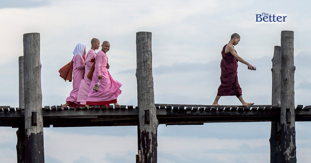 Photo - ภาพถ่ายนี้ถ่ายเมื่อวันที่ 5 กรกฎาคม 2567 แสดงให้เห็นพระสงฆ์กำลังเดินนำหน้าแม่ชีบนสะพานอูเบ็ง ที่ทะเลสาบตองตะมัน ในเมืองมัณฑะเลย์ (ภาพโดย Sai Aung MAIN / AFP)