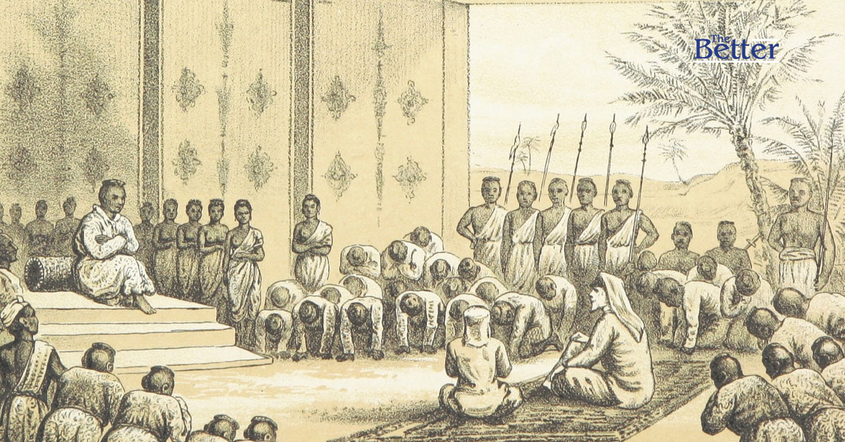 เมื่อถึงเวลานัดหมาย กษัตริย์ทรงต้อนรับพวกเราเข้าเฝ้าด้วยความพยายามอันน้อยนิดที่จะให้สมพระเกียรติ มีบัลลังก์อยู่ เหล่าขุนนางและเหล่าข้าบริพารที่มาร่วมเฝ้า ต่างสวมเสื้อคลุมสีแดงทอง นอนอยู่บนพื้น รอคอยการเสด็จพระราชดำเนินของพระมหากษัตริย์ ผมพบว่าผ้าคลุมศีรษะที่เหมาะสมสำหรับการทรงเครื่องแบบเต็มยศคือหมวกที่คล้ายกับหมวกที่พวกโจรในละครเวทีใช้สวมใส่ มีปีกหมวกแหลมสูงและปีกหมวกกว้างมาก แถบคาดหมวกถูกแทนที่ด้วยมงกุฎชนิดหนึ่ง ผมคิดว่านักเดินเรือชาวโปรตุเกสยุคแรกๆ น่าจะเป็นผู้ริเริ่มหมวกเหล่านี้ ซึ่งพวกเขาดูเหมือนจะให้ความสำคัญอย่างมาก และเนื่องจากหมวกที่ใช้อยู่ในปัจจุบันอยู่ในสภาพทรุดโทรมมาก จึงเกิดความสงสัยใคร่รู้เกี่ยวกับความสามารถของผมในการจัดหาหมวกใบใหม่ อันที่จริงแล้ว ผ้าคลุมศีรษะดูเหมือนจะเป็นจุดอ่อนของเหล่าขุนนางในราชสำนักที่อุดง เพราะเมื่อได้รับเชิญให้เข้าเฝ้า ผมถูกถามว่าจริงหรือไม่ที่ชาวยุโรปมักจะสวมหมวกสีดำที่มีโครงสร้างแปลกประหลาด เมื่อผมได้ยอมรับเรื่องนี้และบรรยายถึงเรื่องนี้แล้ว ความผิดหวังก็ปรากฏชัดเมื่อทราบว่าผมไม่สามารถทำให้พระองค์ท่านพอพระทัยได้ด้วยการสวมหมวกแบบยุโรป