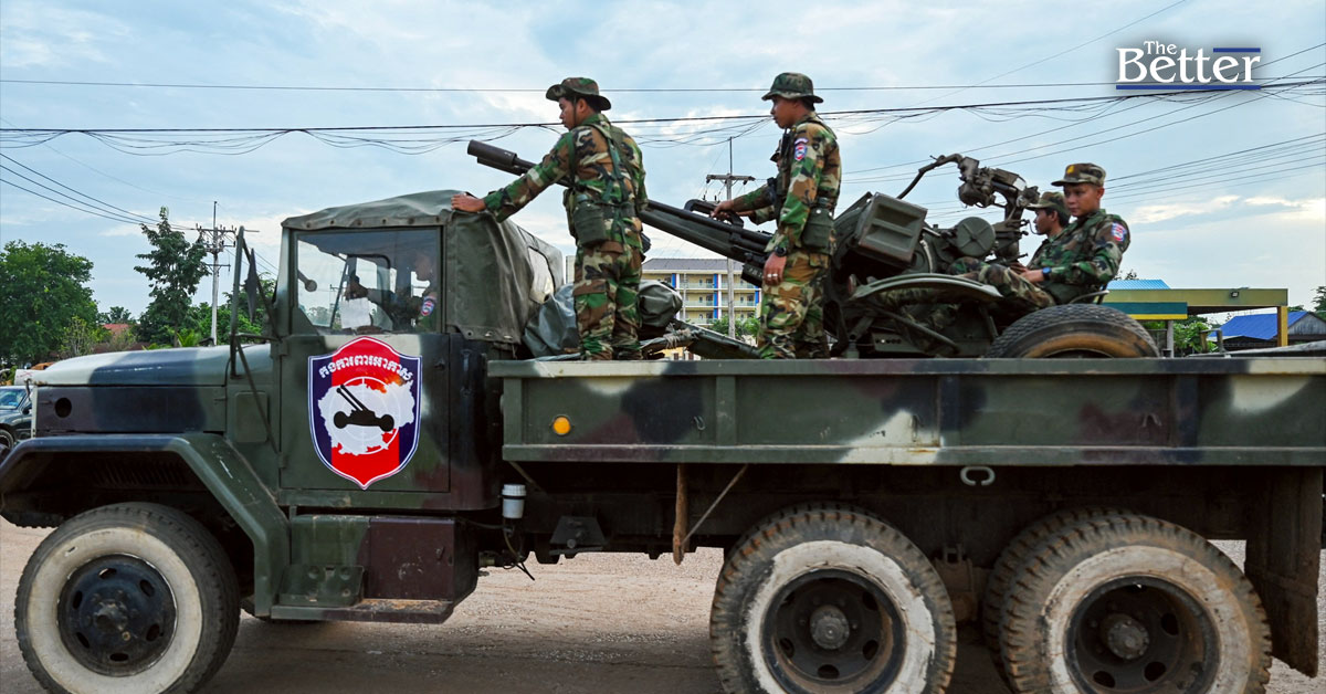 Photo - ทหารกัมพูชายืนอยู่บนรถบรรทุกทหารพร้อมปืนต่อสู้อากาศยานในจังหวัดอุดรมีชัย เมื่อวันที่ 25 กรกฎาคม พ.ศ. 2568 ระหว่างที่ไทยและกัมพูชาเผชิญหน้ากันอย่างนองเลือดที่สุดในรอบกว่าทศวรรษ (ภาพโดย TANG CHHIN Sothy / AFP)