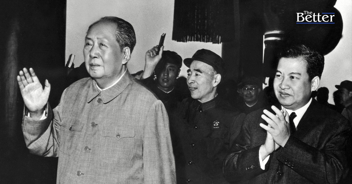 Photo - ภาพแฟ้มนี้เผยแพร่โดยหน่วยงานทางการจีน ถ่ายเมื่อวันที่ 22 พฤษภาคม พ.ศ. 2513 แสดงให้เห็นประธานาธิบดีเหมาเจ๋อตง (ซ้าย) โบกมือให้ฝูงชน ขณะที่รองประธานาธิบดีหลินเปียว (กลาง) ชูหนังสือปกแดงของเหมา ขณะเข้าเฝ้าฯ เจ้านโรดม สีหนุ (ขวา) ทรงปรบมือระหว่างการชุมนุมใหญ่ ณ จัตุรัสเทียนอันเหมิน ในกรุงปักกิ่ง ภาพ CHINA OUT (ภาพโดย XINHUA / AFP)