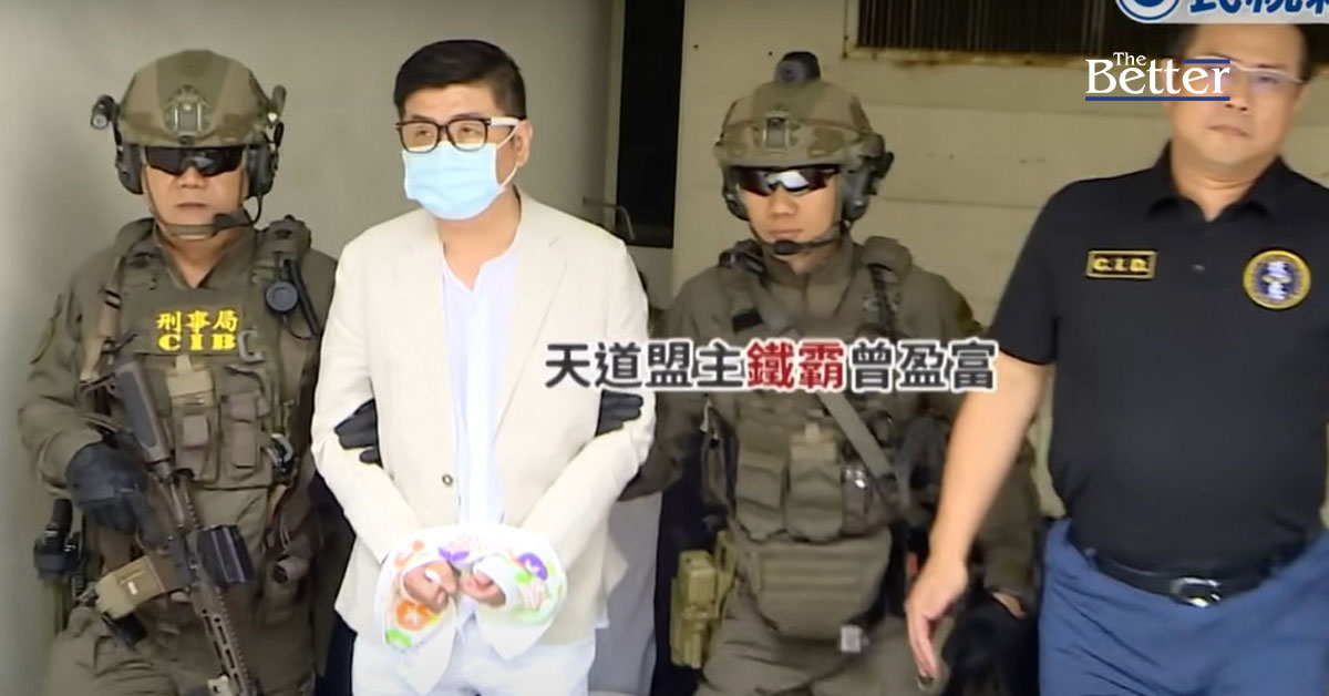 Photo - เจิ้งอิ๋งฟู่ หัวหน้าคนปัจจุบันของสันนิบาตเทียนต้าว ถูกตำรวจไต้หวันจับกุมในข้อหาฟอกเงินและการพนัน (Video captured from 民視新聞網 Formosa TV News network)