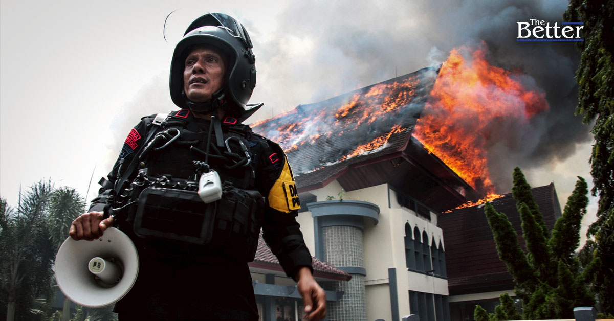 Photo - TOPSHOT - เจ้าหน้าที่ตำรวจยืนถือเครื่องขยายเสียงในขณะที่อาคารสำนักงานสภาจังหวัดนูซาเต็งการาตะวันตกกำลังถูกไฟไหม้ หลังจากถูกผู้ประท้วงจุดไฟเผาในเมืองมาตารัม บนเกาะลอมบอก นูซาเต็งการาตะวันตก เมื่อวันที่ 30 สิงหาคม 2568 อินโดนีเซียได้รับผลกระทบจากการประท้วงในเมืองใหญ่ๆ รวมถึงกรุงจาการ์ตา เมืองหลวง เมื่อวันที่ 29 สิงหาคม หลังจากที่มีการเผยแพร่ภาพคนขับมอเตอร์ไซค์รับจ้างถูกรถตำรวจชนในการชุมนุมก่อนหน้านี้เพื่อประท้วงค่าจ้างต่ำและสวัสดิการทางการเงินของสมาชิกรัฐสภา (Photo by Sadim / AFP)