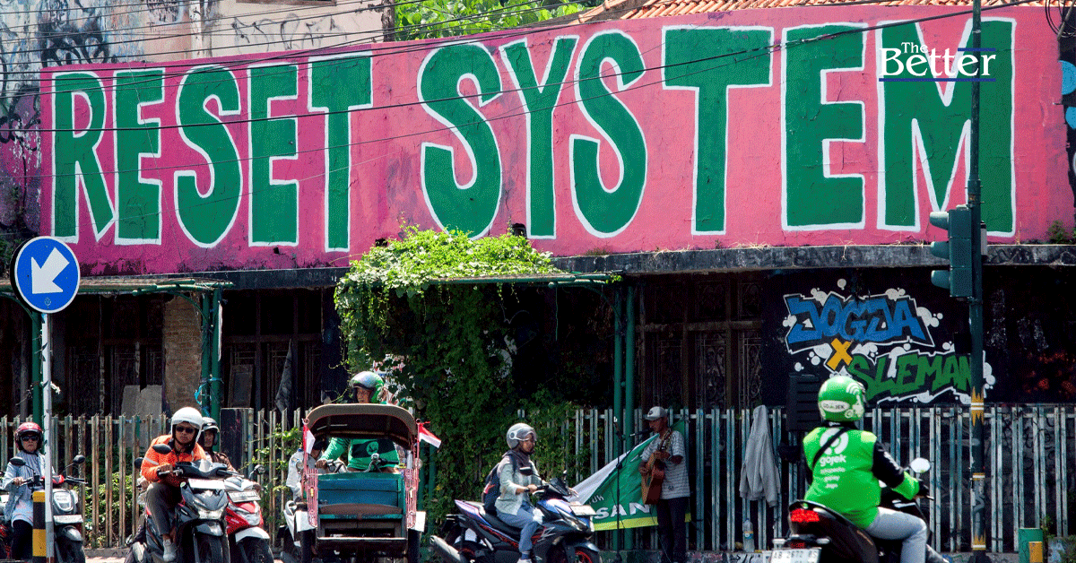 ข้อความ "รีเซ็ตระบบ" (RESET SYSTEM") ปรากฏเป็นนภาพกราฟฟิตี้เหนือสี่แยกในเมืองยอกยาการ์ตา ประเทศชวา ตัวอักษรถูกทาสีเขียวและชมพูสดใส ด้วยเส้นที่ดูเร่งรีบ ท่ามกลางการประท้วงที่รุนแรงถึงขั้นนองเลือดในอินโดนีเซียที่เริ่มต้นขึ้นเมื่อสัปดาห์ที่แล้ว