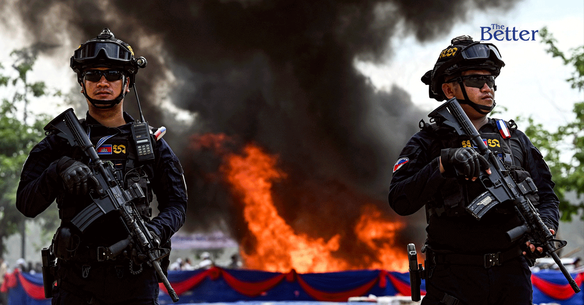 Photo – เจ้าหน้าที่ตำรวจทหารกัมพูชายืนเฝ้าหน้ากองยาเสพติดที่กำลังเผาไหม้ ระหว่างพิธีทำลายล้างเนื่องใน "วันต่อต้านยาเสพติดและการค้าผิดกฎหมายสากล" ของสหประชาชาติ ในกรุงพนมเปญ เมื่อวันที่ 28 มิถุนายน 2566 (ภาพโดย TANG CHHIN SOTHY / AFP)