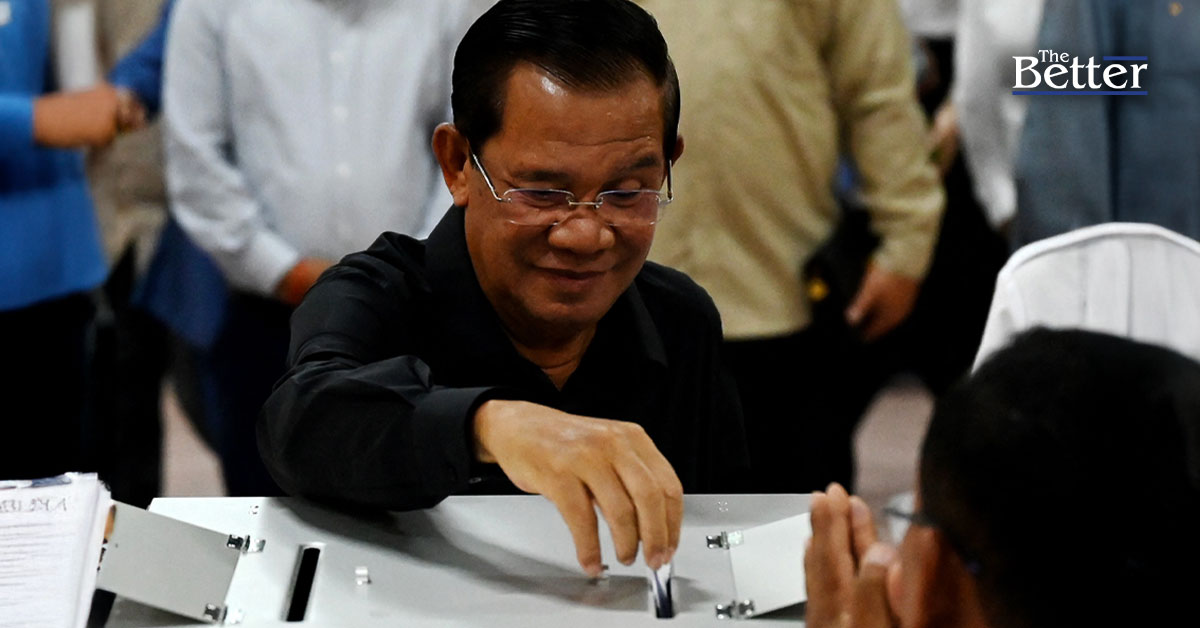 Photo - (ภาพประกอบข่าว) - สมาชิกรัฐสภาและอดีตนายกรัฐมนตรีฮุนเซน ลงคะแนนเสียงที่สถานีลงคะแนนเสียงระหว่างการเลือกตั้งวุฒิสภาในเมืองทัคเมา จังหวัดกันดาล เมื่อวันที่ 25 กุมภาพันธ์ 2567 (ภาพโดย TANG CHHIN Sothy / AFP)