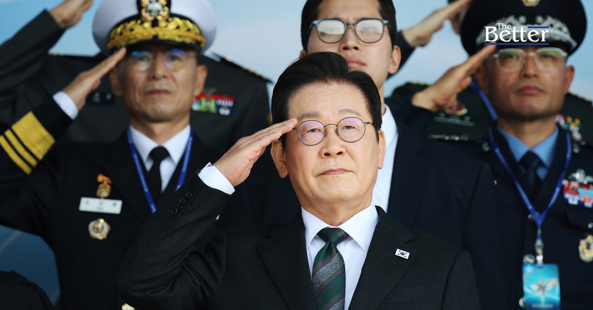 Photo - ประธานาธิบดีเกาหลีใต้ อี แจ-มยอง (กลาง) เคารพธงชาติในพิธีเฉลิมฉลองวันกองทัพครบรอบ 77 ปี ณ เมืองคเยรยอง เมื่อวันที่ 1 ตุลาคม พ.ศ. 2568 (ภาพโดย KIM HONG-JI / POOL / AFP)