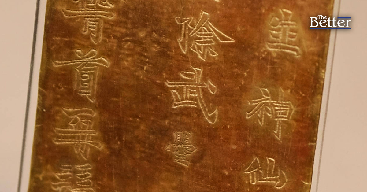 ประวัติของมันก็น่าสนใจไม่น้อย เพราะถูกพบโดย ชวีซีหวาย ชาวนาจากเมืองเติงเฟิง มณฑลเหอหนาน ในเดือนพฤษภาคม พ.ศ. 2525 โดยเขาสังเกตเห็นชิ้นทองคำระยิบระยับที่ซ่อนอยู่ในรอยแยกบนยอดเขาจวิ้นจี๋บนภูเขาซงซาน ต่อมาได้รับการยืนว่าเป็นแผ่นทองคำที่พระนางบูเช็กเทียน หรือ "อู่จ้าว" ทรงถวายแก่เทพเจ้าประจำภูเขาซงซาน (ภูเขาซงซานถือเป็นศูนย์กลางโลกตามคติจีนโบราณ) เพื่อวิงวอนจากเทพเจ้าขอให้พระพลานามัยแข็งแรงปลอดจากโรคภัย