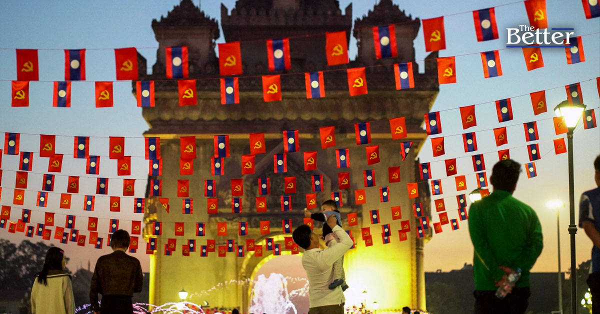 Photo - ภาพนี้ถ่ายเมื่อวันที่ 28 พฤศจิกายน 2568 แสดงให้เห็นผู้คนกำลังเดินอยู่ใต้ธงชาติลาวและธงพรรคประชาชนปฏิวัติลาว ข้าง "ประตูไซ" ในกรุงเวียงจันทน์ ก่อนการเฉลิมฉลองวันชาติลาวในวันที่ 2 ธันวาคม ซึ่งตรงกับวาระครบรอบ 50 ปีการปกครองระบอบคอมมิวนิสต์ (Photo by BEATRICE SIVIERO / AFP)