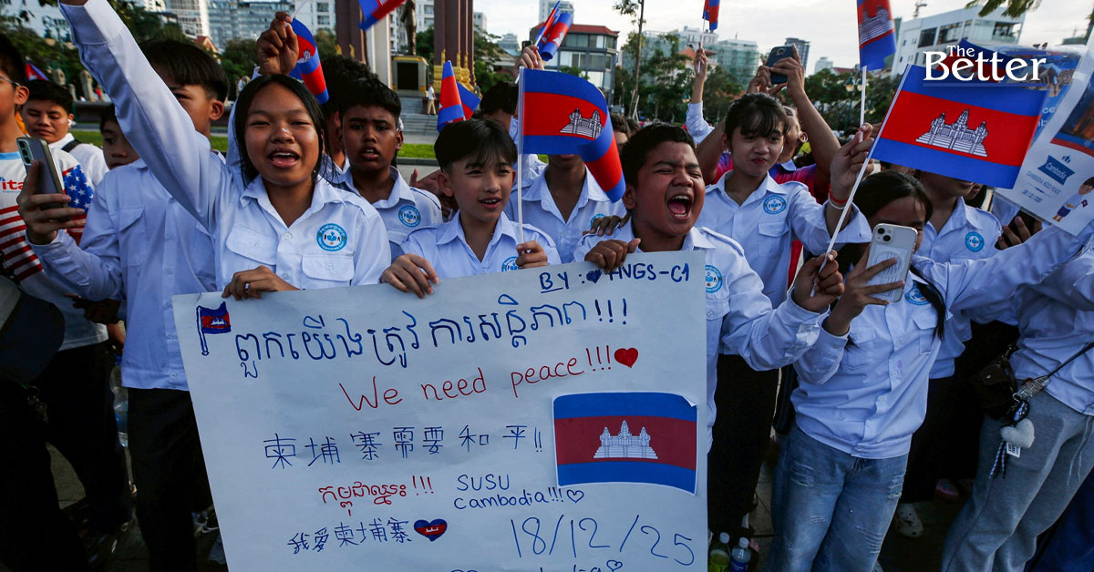 Photo - ประชาชนถือป้ายและโบกธงชาติกัมพูชาขณะเข้าร่วมการเดินขบวนเพื่อสนับสนุนกัมพูชาและเรียกร้องสันติภาพในความขัดแย้งชายแดนกัมพูชา-ไทย ที่กรุงพนมเปญ เมื่อวันที่ 18 ธันวาคม 2025 (ภาพโดย AFP)