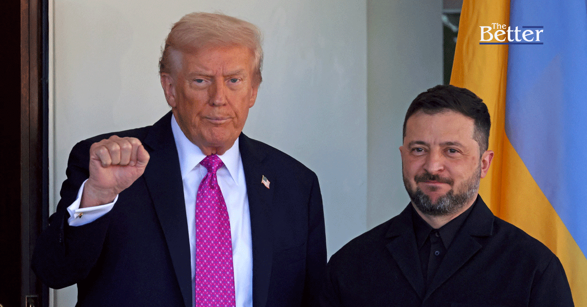 Photo - ประธานาธิบดีโดนัลด์ ทรัมป์ แห่งสหรัฐอเมริกา โบกมือทักทายประธานาธิบดีโวโลดีมีร์ เซเลนสกี แห่งยูเครน ขณะเดินทางมาถึงทำเนียบขาวในกรุงวอชิงตัน ดี.ซี. เพื่อเข้าร่วมการประชุม เมื่อวันที่ 17 ตุลาคม 2568 (ภาพโดย TOM BRENNER / AFP)