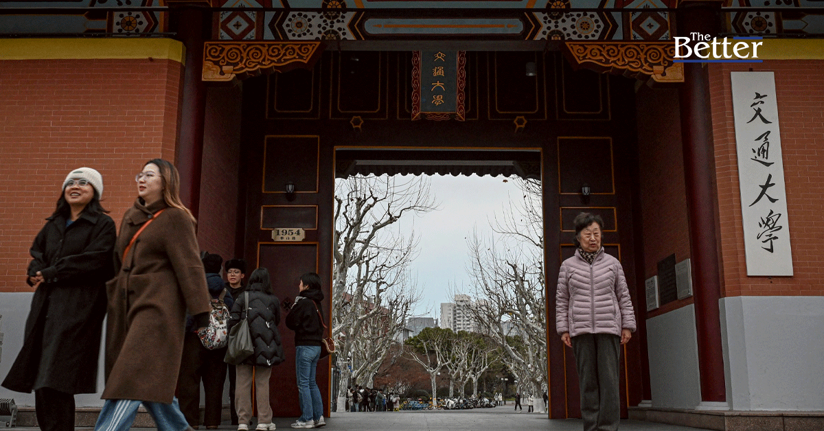 Photo - หญิงชราคนหนึ่ง (ขวา) โพสท่าถ่ายรูปที่ทางเข้ามหาวิทยาลัยเซี่ยงไฮ้เจียวถง ในเซี่ยงไฮ้ เมื่อวันที่ 31 ธันวาคม 2025 ขณะนี้รัฐบาลจีนได้พยายามดึงดูดนักวิทยาศาสตร์ชั้นนำจากต่างประเทศมาเป็นเวลานาน แต่เหล่านักวิจัยกล่าวว่าสถาบันของจีนเองก็ดึงดูดผู้มีความสามารถได้มากขึ้นเรื่อยๆ ด้วยเงินทุนสนับสนุนที่มากมายและชื่อเสียงที่เพิ่มสูงขึ้น (Photo by JADE GAO / AFP)