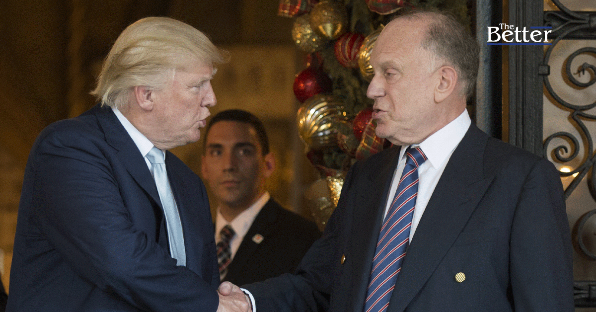 Photo - โดนัลด์ ทรัมป์ ว่าที่ประธานาธิบดีสหรัฐฯ ในขณะนั้นจับมือกับ โรนัลด์ ลอเดอร์ ประธานสภาชาวยิวโลก หลังจากการประชุมเมื่อวันที่ 28 ธันวาคม 2016 ณ มาร์-อา-ลาโก ในปาล์มบีช รัฐฟลอริดา (Photo by DON EMMERT / AFP)