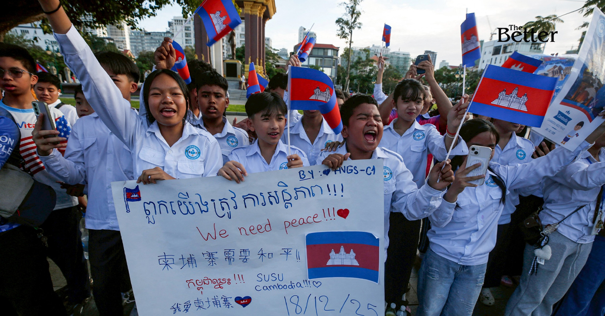Photo - ประชาชนถือป้ายและโบกธงชาติกัมพูชาขณะเข้าร่วมการเดินขบวนเพื่อสนับสนุนกัมพูชาและเรียกร้องสันติภาพในความขัดแย้งชายแดนกัมพูชา-ไทย ที่กรุงพนมเปญ เมื่อวันที่ 18 ธันวาคม 2025 (ภาพโดย AFP)