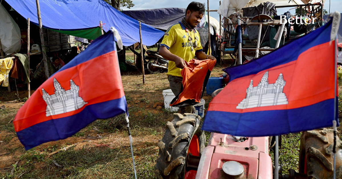 Photo - ชายคนหนึ่งกำลังตากผ้าอยู่ที่ค่ายพักชั่วคราวในจังหวัดอุดรเมียนชัย ประเทศกัมพูชา เมื่อวันที่ 11 ธันวาคม 2025 ท่ามกลางการปะทะกันตามแนวชายแดนกัมพูชา-ไทย (Photo by TANG CHHIN SOTHY / AFP)