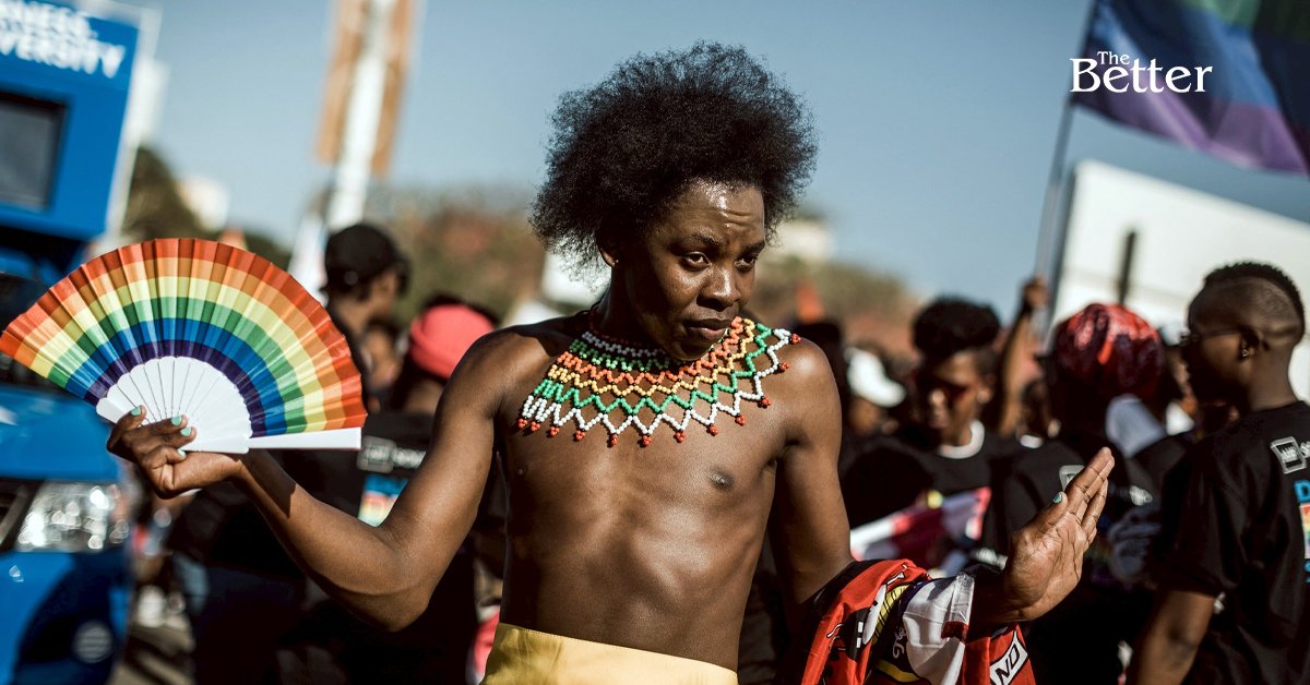 Photo - (ภาพประกอบข่าวไม่เกี่ยวกับเซเนกัล) สมาชิกคนหนึ่งของชุมชนเลสเบี้ยน เกย์ ไบเซ็กชวล ทรานส์เจนเดอร์ และอินเตอร์เซ็กซ์ (LGBTI) ในแอฟริกาใต้ แสดงท่าทางระหว่างขบวนพาเหรดเกย์ไพรด์ประจำปี ซึ่งเป็นส่วนหนึ่งของเทศกาลเดอร์บันไพรด์ เมื่อวันที่ 29 มิถุนายน 2019 ในเมืองเดอร์บัน (ภาพโดย Rajesh JANTILAL / AFP)