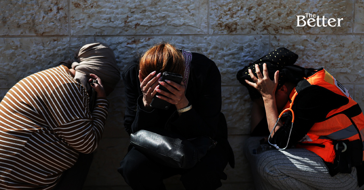 Photo - ผู้คนหลบภัยเมื่อเสียงไซเรนเตือนภัยสงครามดังขึ้นระหว่างพิธีศพของซาราห์และโรนิต เอลิเมเลค ในวันถัดจากเหตุการณ์โจมตีด้วยขีปนาวุธที่เบธเชเมช ซึ่งอยู่ห่างจากกรุงเยรูซาเลมไปทางตะวันตกประมาณ 30 กิโลเมตร คร่าชีวิตผู้คนไปหลายคน เมื่อวันที่ 2 มีนาคม 2026 (Photo by ILIA YEFIMOVICH / AFP)
