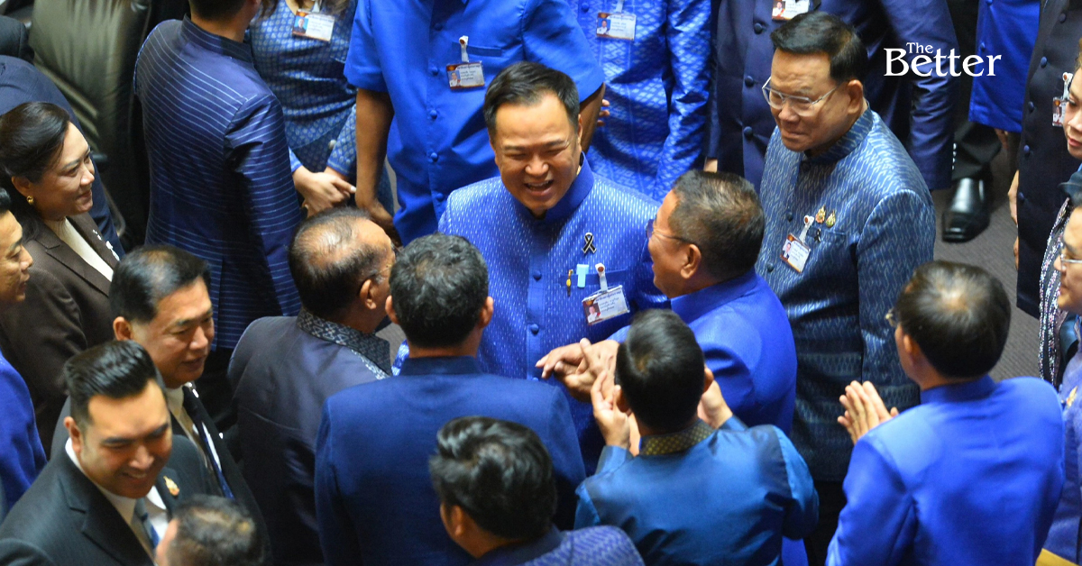 (แฟ้มภาพซินหัว : อนุทิน ชาญวีรกุล (กลาง) จากพรรคภูมิใจไทย หลังจากได้รับเลือกเป็นนายกรัฐมนตรีไทยอีกสมัยที่อาคารรัฐสภาในกรุงเทพฯ วันที่ 19 มี.ค. 2026)