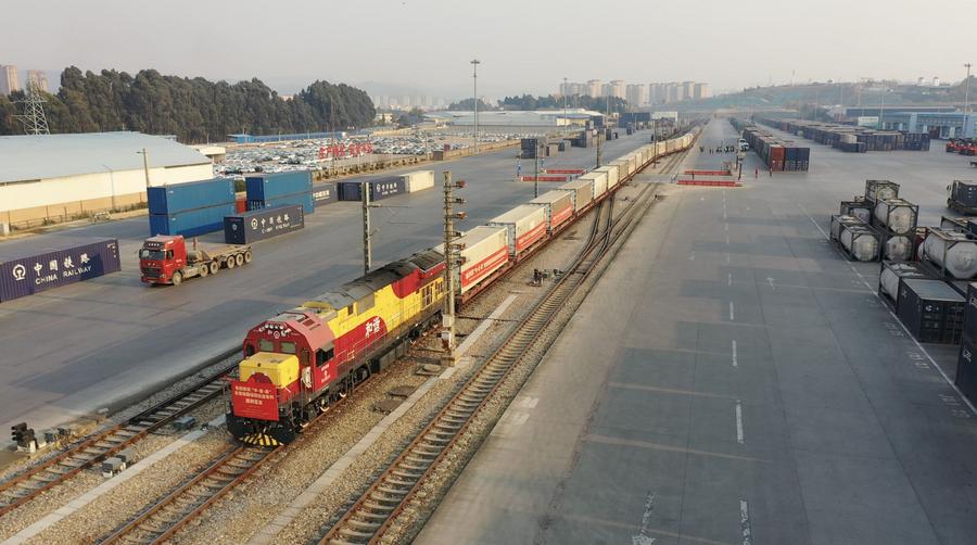 ซินหัวรายงานว่า รถไฟสินค้าระหว่างประเทศจีน-ลาว ซึ่งบรรทุกตู้คอนเทนเนอร์แช่เย็นผักสดราว 280 ตัน จำนวน 19 ตู้ วิ่งออกจากสถานีรถไฟในนครคุนหมิง มณฑลอวิ๋นหนาน (ยูนนาน) ทางตะวันตกเฉียงใต้ของจีน เมื่อวันอังคาร (7 ก.พ.) ซึ่งเป็นหมุดหมายเปิดให้บริการรถไฟสินค้า “จีน-ลาว-ไทย” แบบไป-กลับ