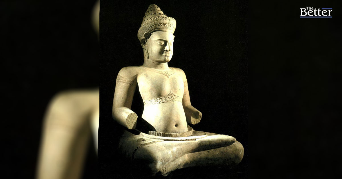 (ภาพไม่ระบุวันที่จากกระทรวงวัฒนธรรมและวิจิตรศิลป์ของกัมพูชา : รูปแกะสลักซึ่งเชื่อว่าเป็น "ธฤษฏัทยุมนะ" แม่ทัพฝ่ายปาณฑพในมหากาพย์มหาภารตะ ถูกส่งคืนแก่กัมพูชาจากสหรัฐฯ )