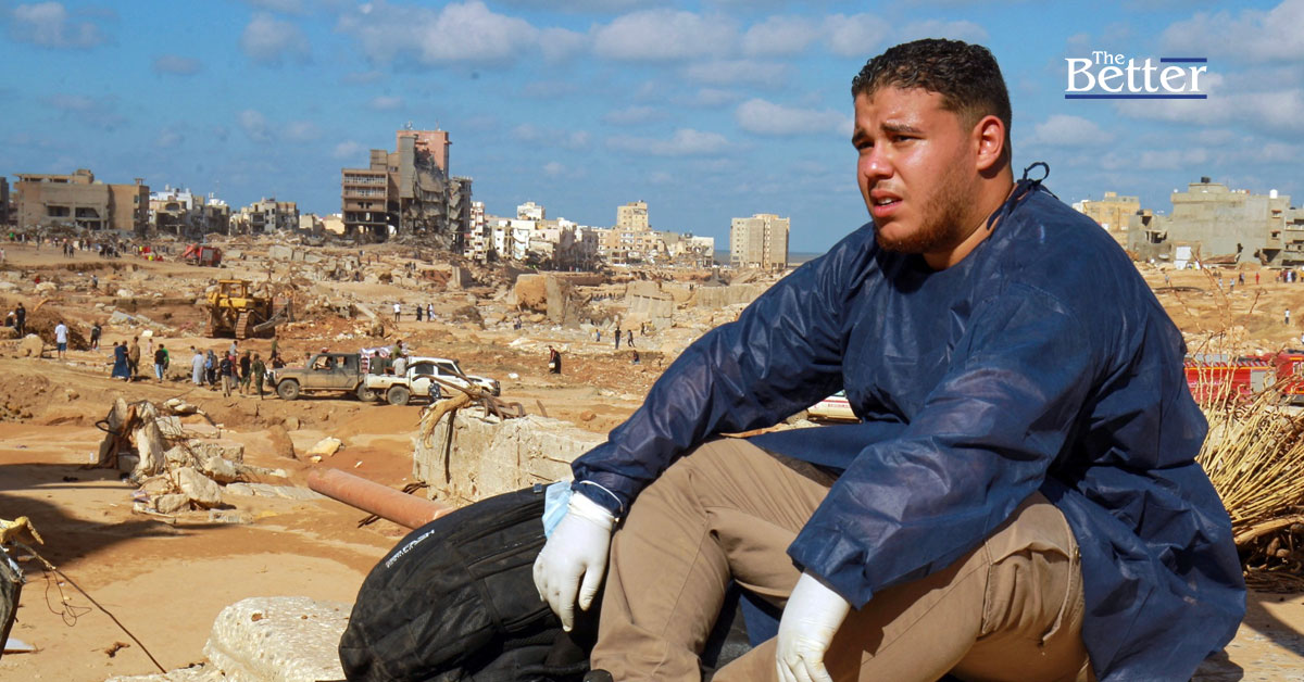 PHOTO TOPSHOT - อาสาสมัครนั่งอยู่บนเศษซากของอาคารในพื้นที่ที่ได้รับความเสียหายจากน้ำท่วมฉับพลันในเมืองเดอร์นาเมื่อวันที่ 14 กันยายน 2566 ส่วนหนึ่งเป็นผลมาจากมรดกแห่งสงครามและความโกลาหลที่สั่งสมมานานหลายปี (Photo by Abdullah DOMA / AFP)