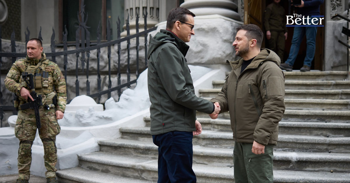 Photo - President Of Ukraine (CC0) ภาพ มาแตอุช มอราวีแยตสกี (Mateusz Morawiecki) นายกรัฐมนตรีโปแลนด์ กับประธานาธิบดียูเครน วอลอดือมือร์ แซแลนสกึย (Volodymyr Zelenskyy) ระหว่างการประชุมที่กรุงเคียฟ 24 กุมภาพันธ์ 2566